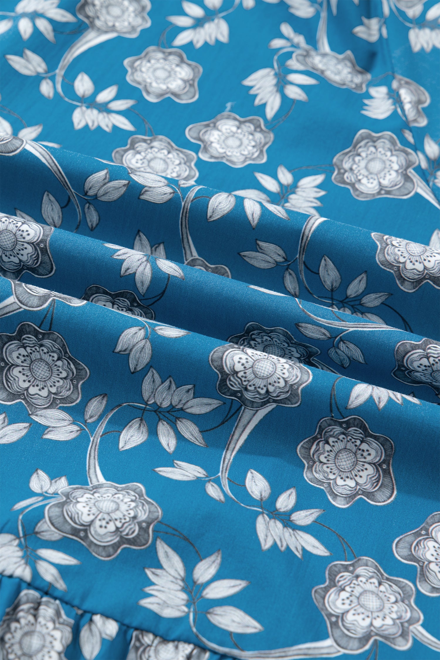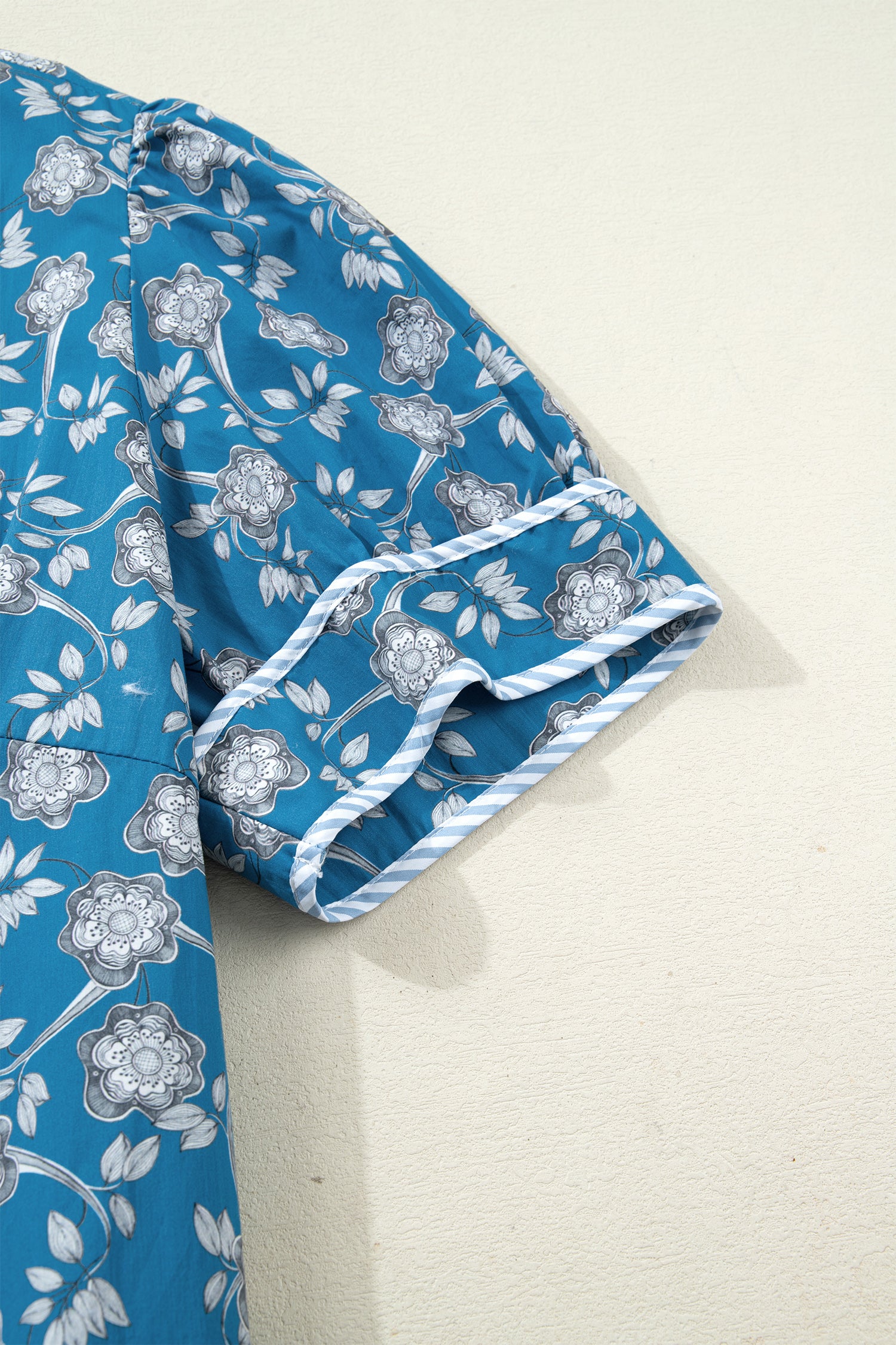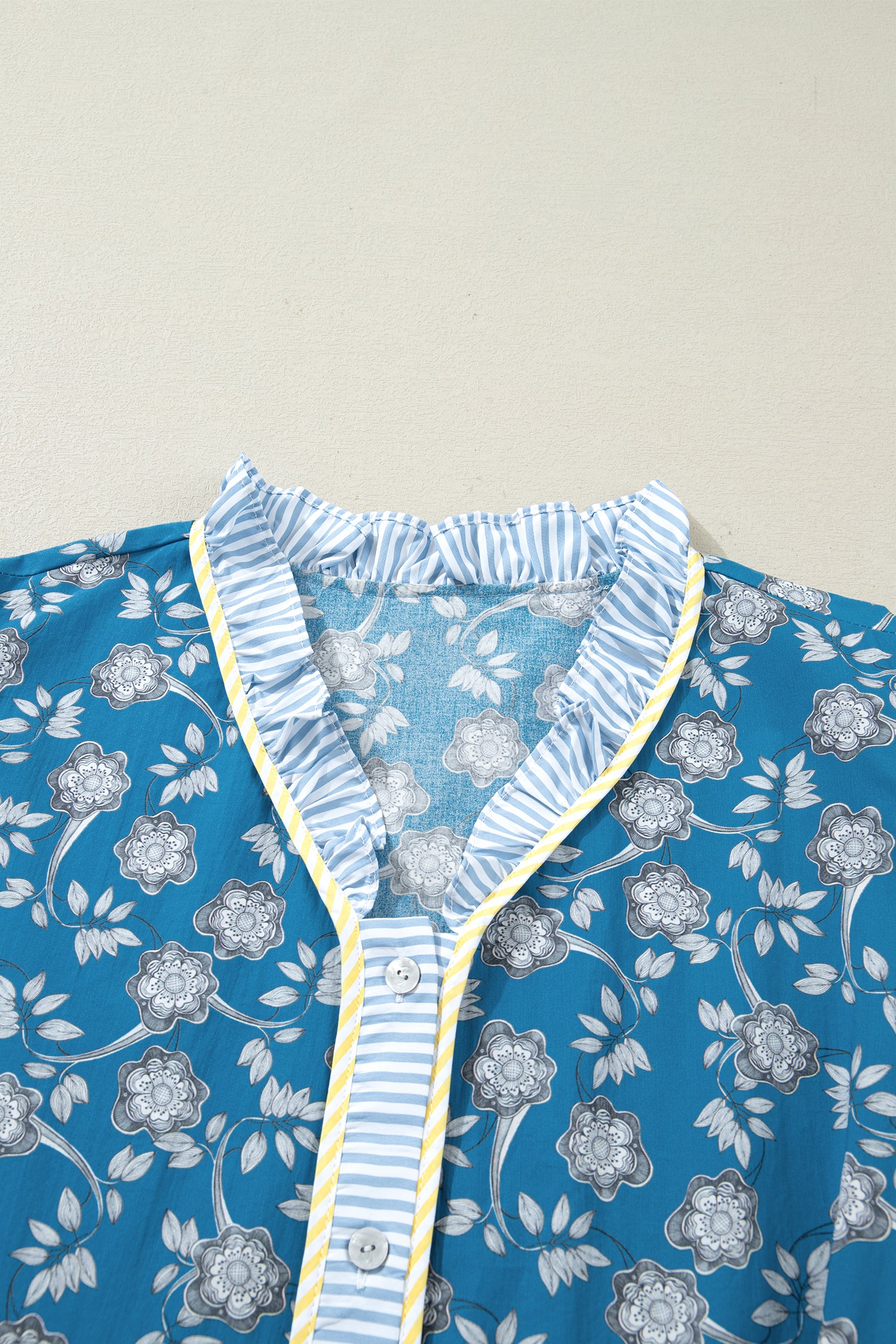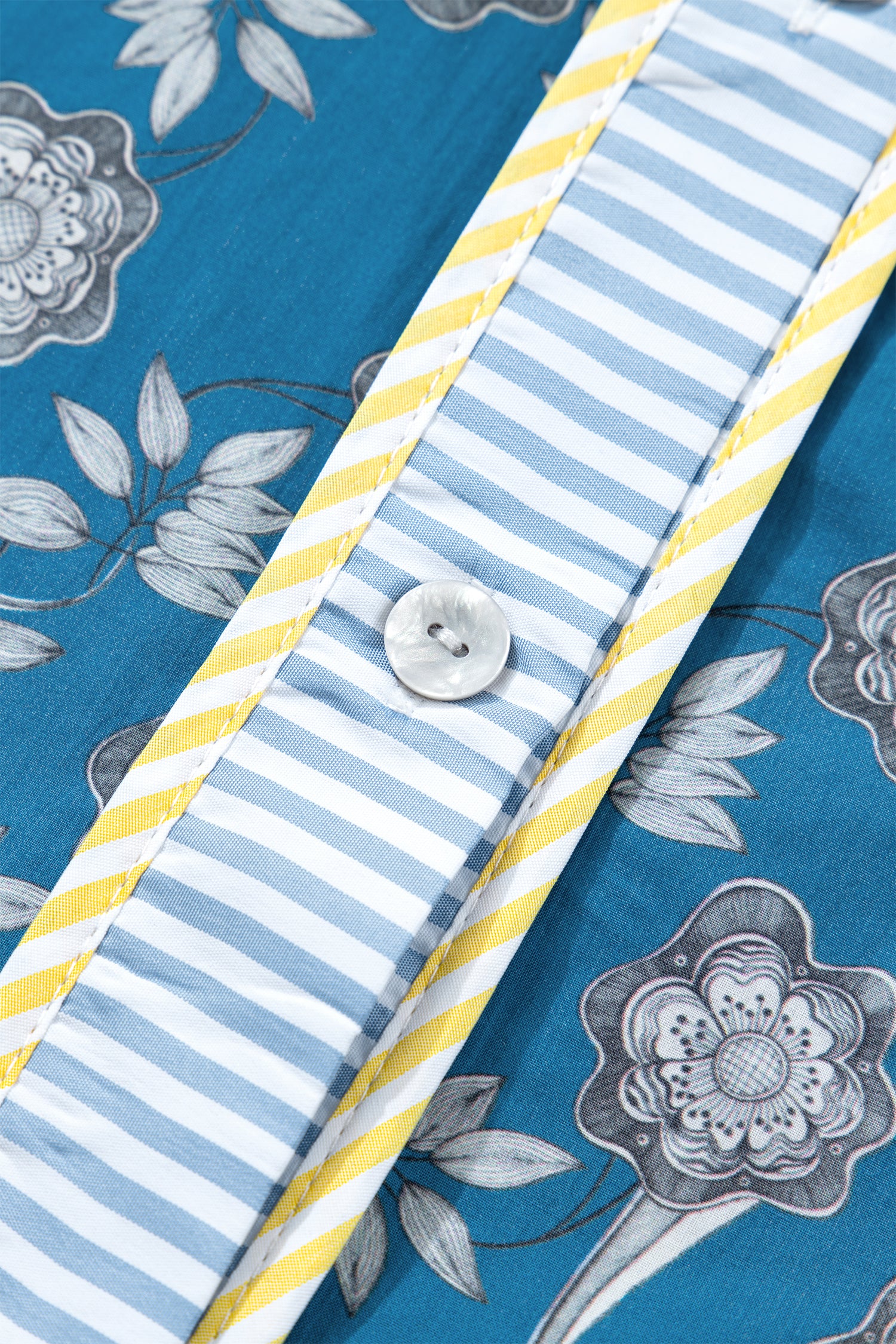 Blue Plus Size Floral Print Striped Patchwork Detail Button Front Ruffle Hem Dress
