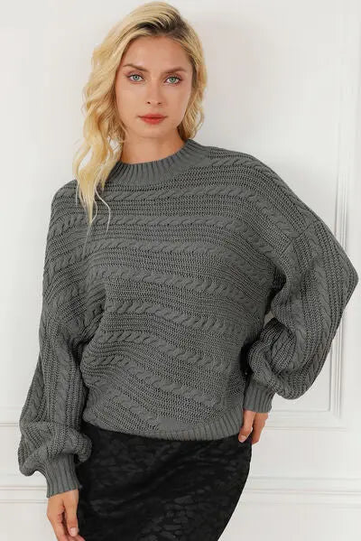 Blue Zone Planet | Cable-Knit Mock Neck Dropped Shoulder Sweater