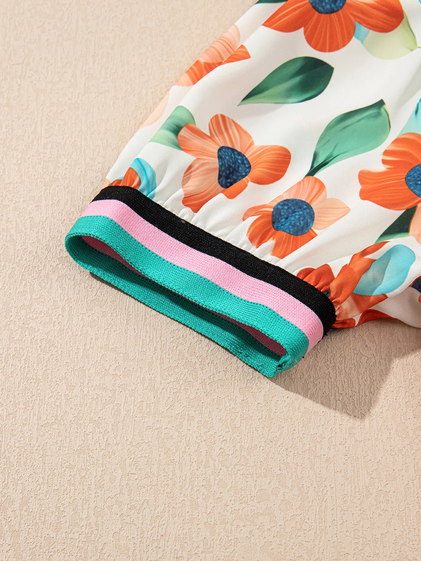Contrast Trim Floral Split Neck Puff Short Sleeve Tiered Mini Dress
