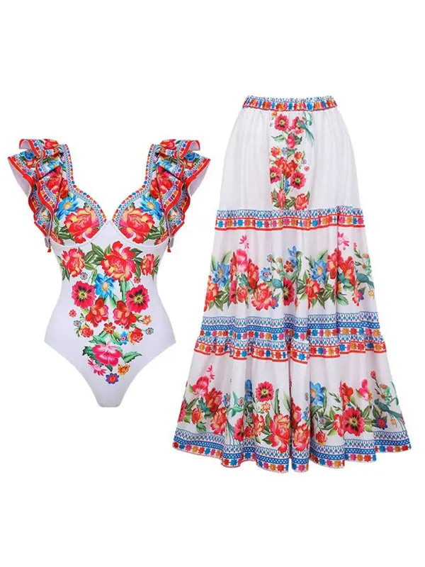 The new trendy sexy floral print one-piece swimsuit skirt (single piece) is a multifunctional garment that combines a swimsuit and a fashionable skirt. Can be purchased together. There are a variety of patterns to choose from, such as floral combination patterns in different colors, allowing you to choose the pattern that suits you according to your personal preferences.