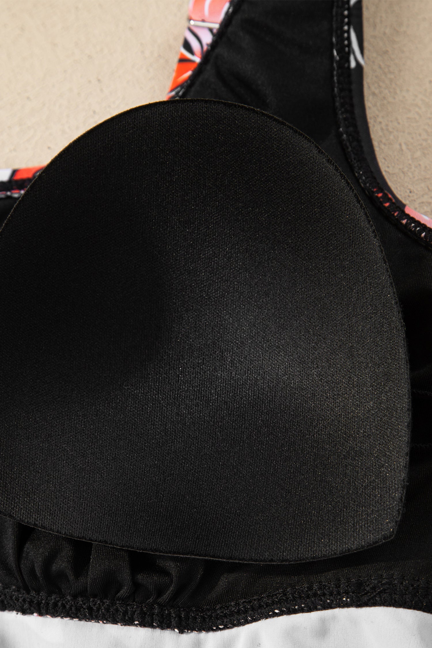 It has padded cups, adjustable straps, and drawstring at side.