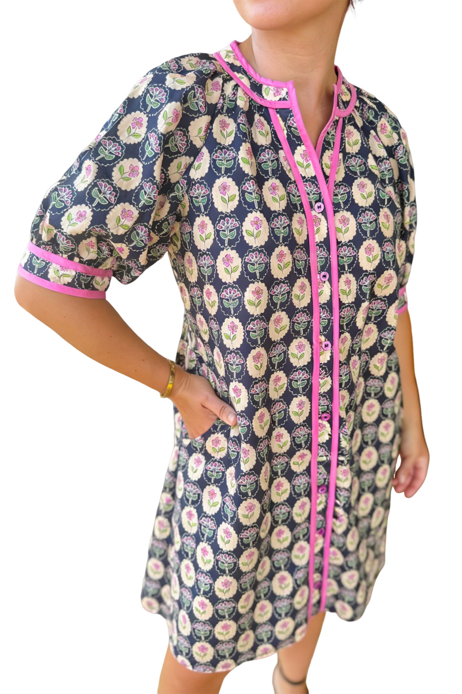 Blue Striped Trim Short Sleeve Vintage Floral Shift Dress