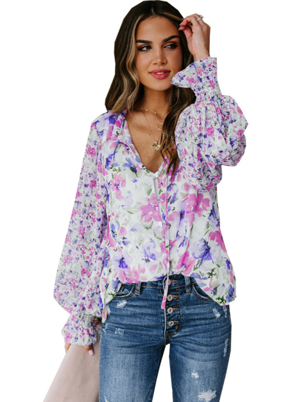 Blue Zone Planet | Women's Loose Floral Pattern Lantern Sleeve Top