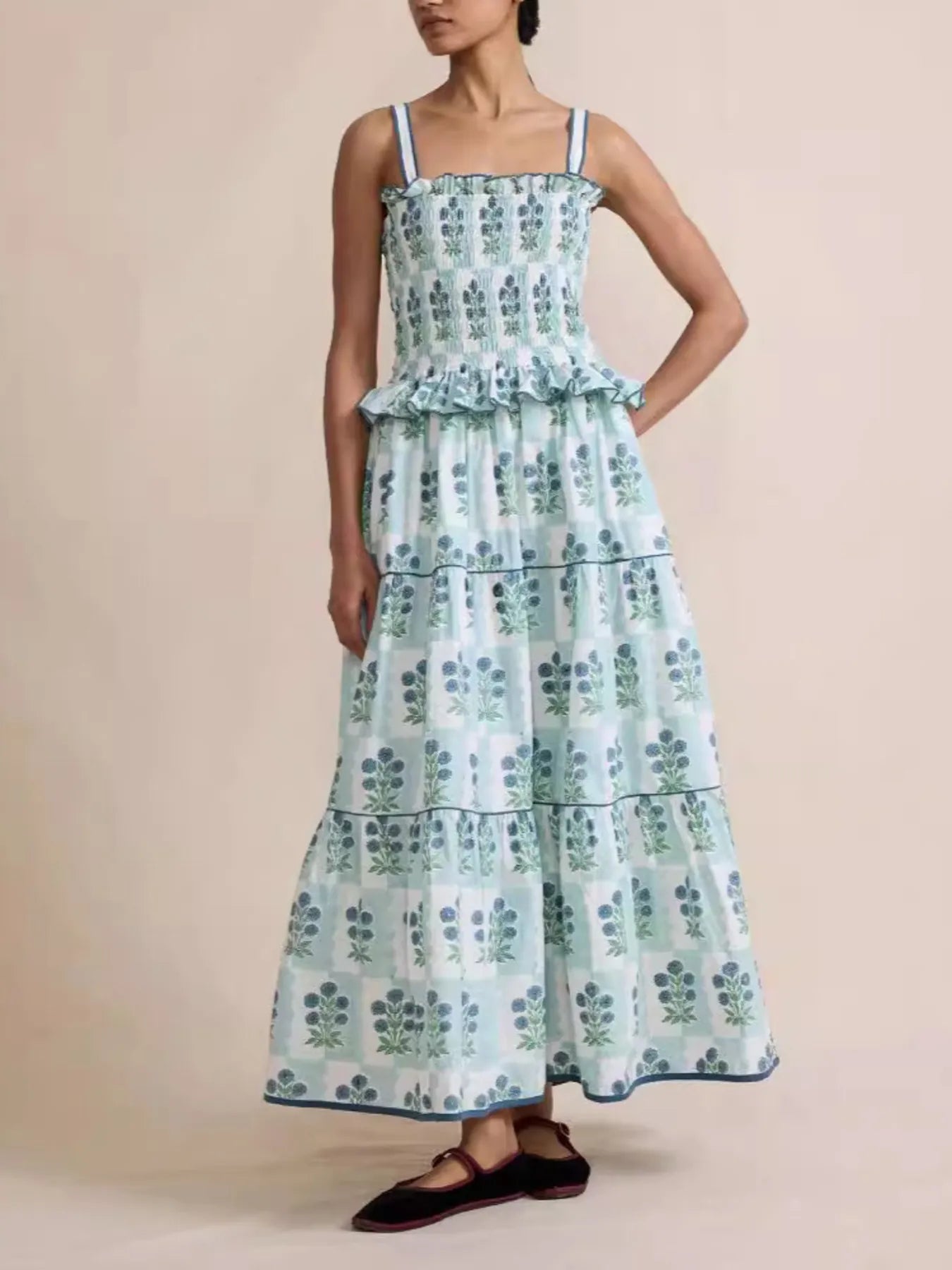 Bohemian Floral Print Smocked Tiered Maxi Dress