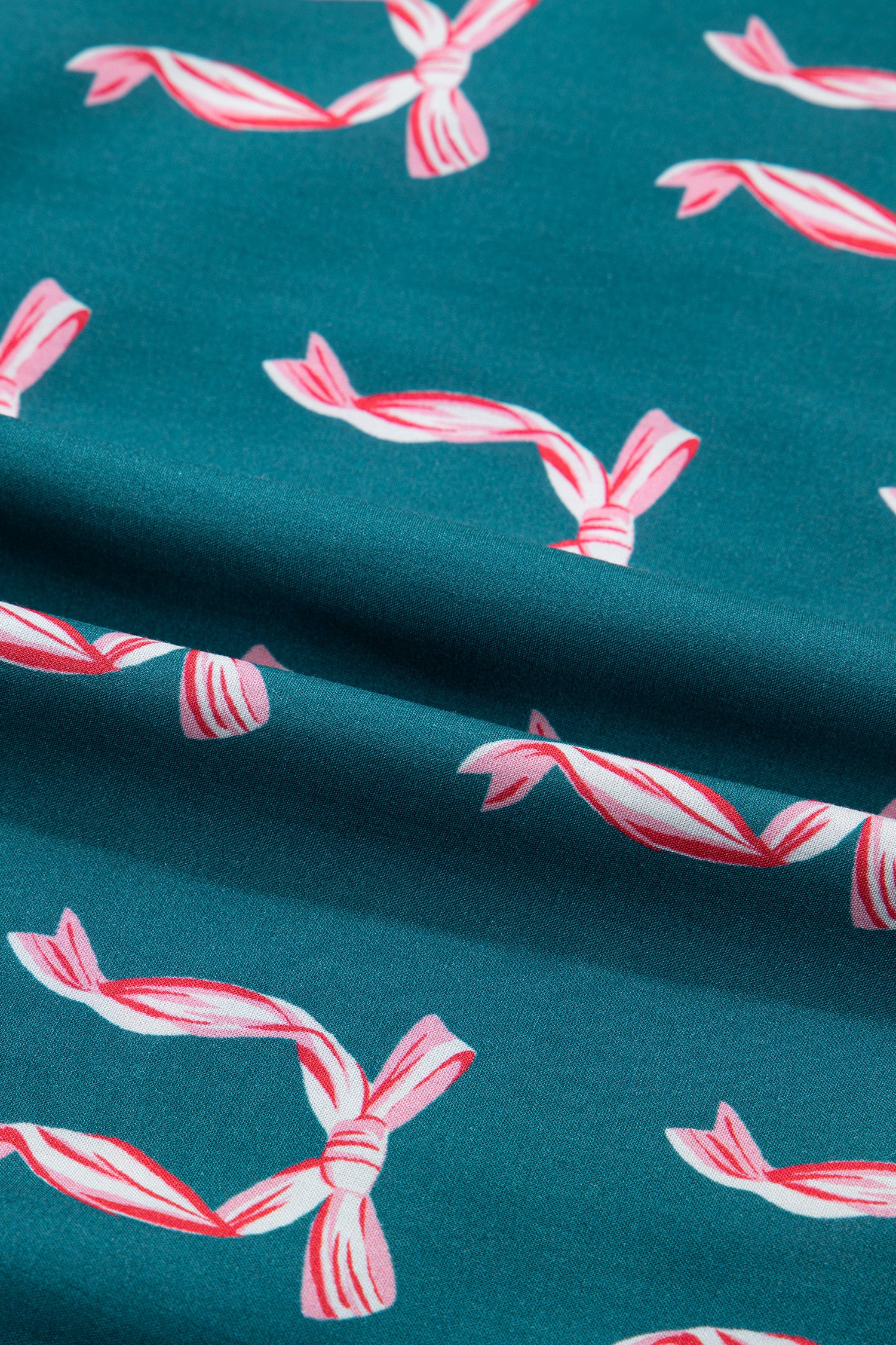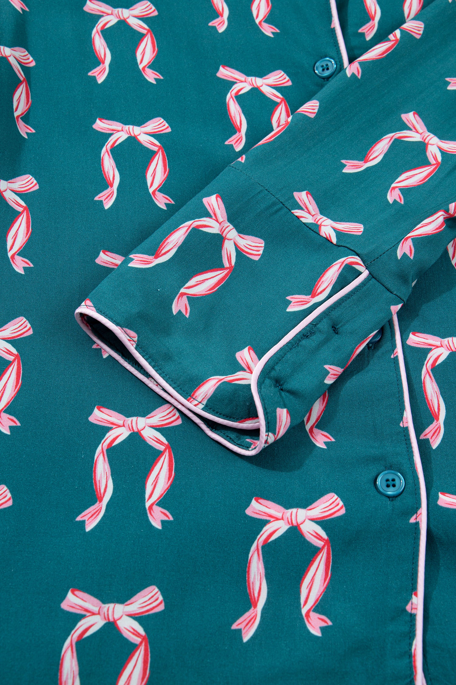 Green Ribbon Bow Print Silky Long Sleeve Shirt and Shorts 2pcs Pajama Set