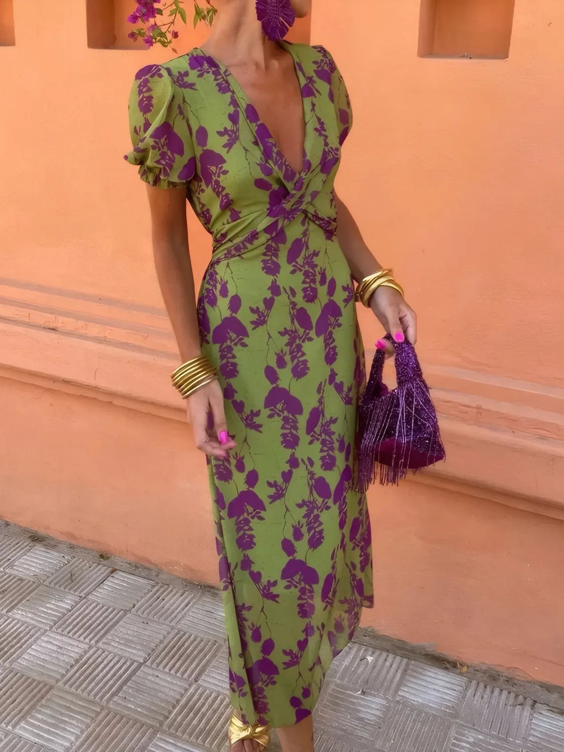 Printed Plunge Short Sleeve Midi Dress