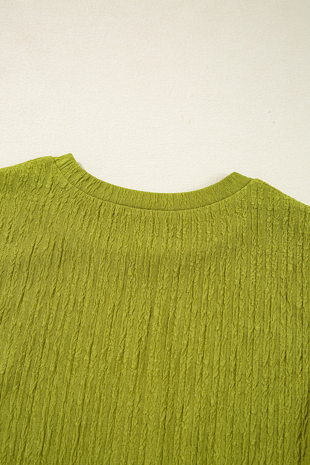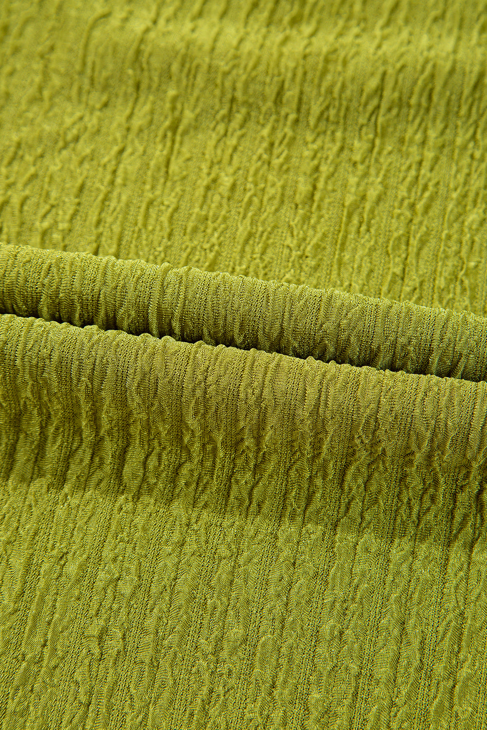 Solid color design with fine texture and ruched details.