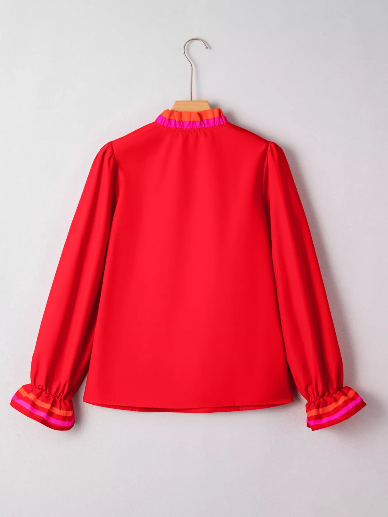 Striped Trim Ruffle Split Neck Long Sleeve Blouse
