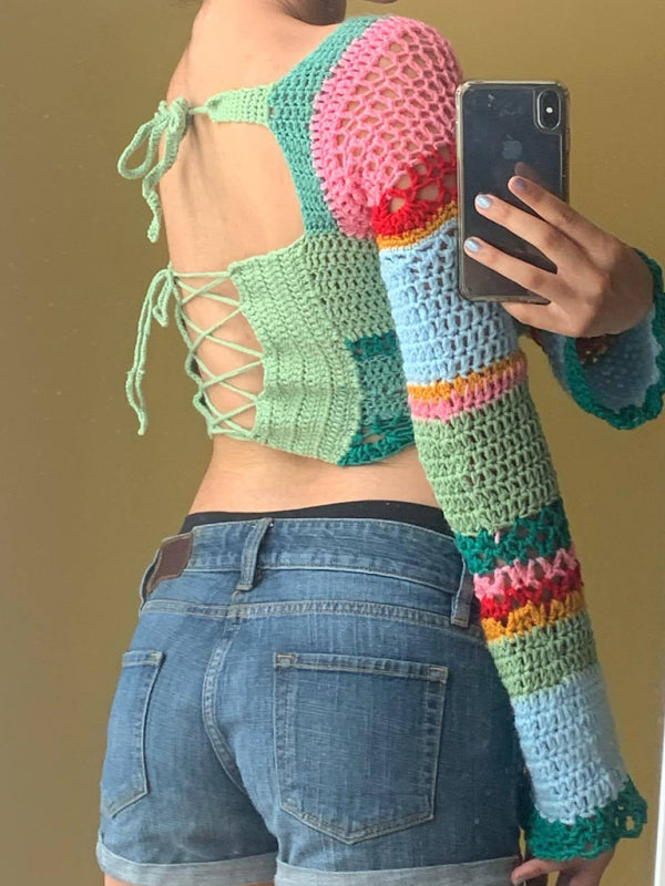 Blue Zone Planet | Women's new square collar colorful striped color block handmade crocheted long-sleeved top